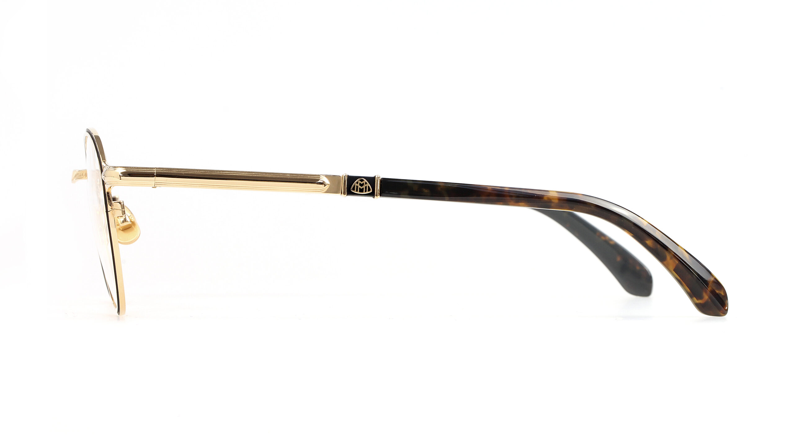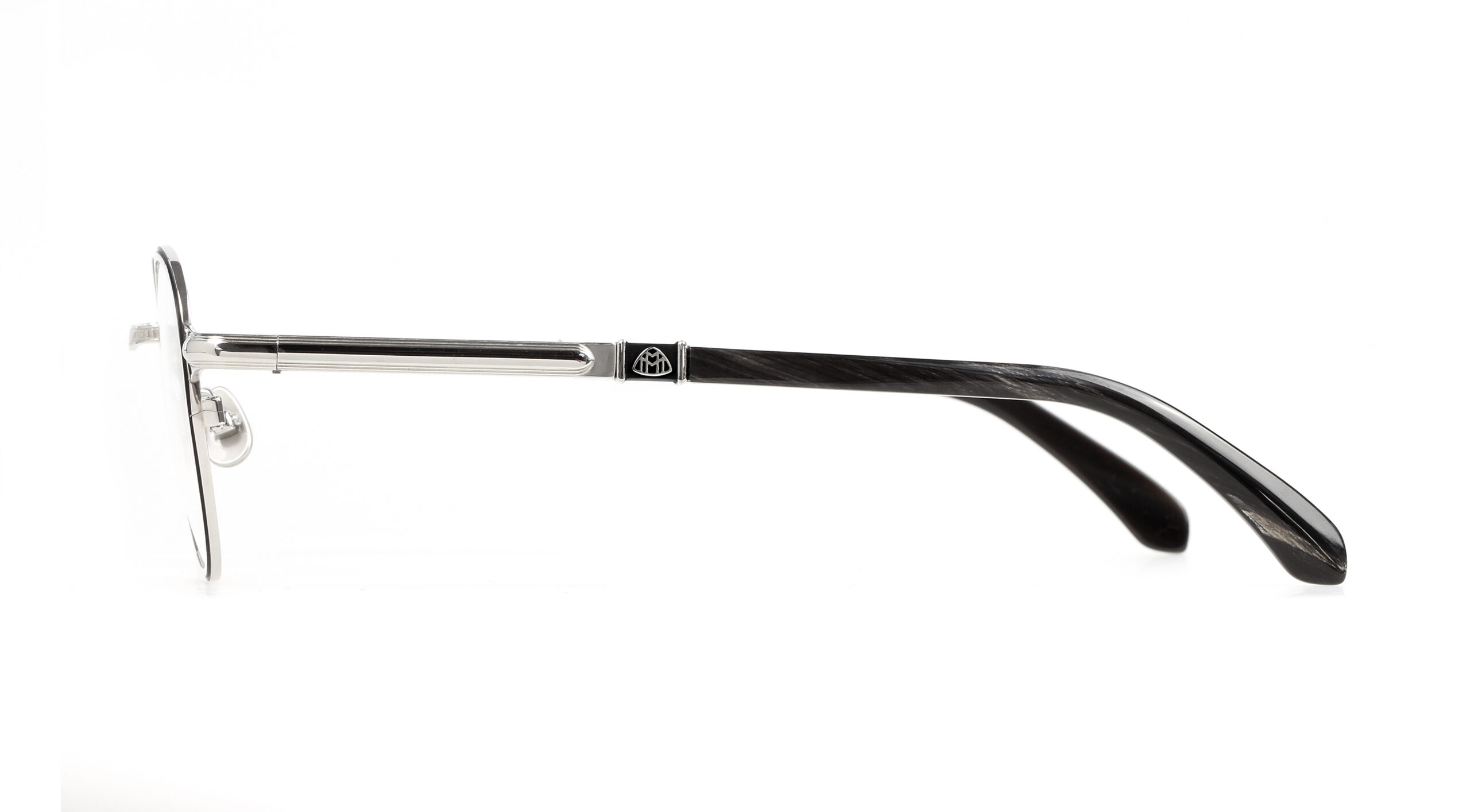 THE ENTREPRENEUR is available with uncluttered round or squared-off panto rims, while the two-tone frontand radiator grill effect on the bridge draw the eye. Titanium with precious plating means a light, robust and elegant frame. The MAYBACH „Flowing Lines“ and logo on the temples contrast with the hand-crafted genuine buffalo horn and acetate temple ends.